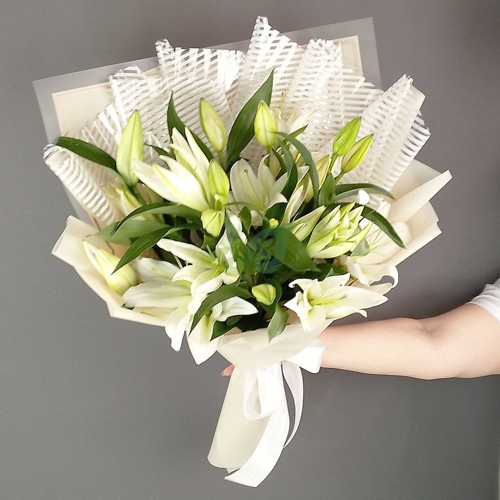 Белые лилии – это недорогой, но очень красивый букет в подарок. Этими цветами можно поблагодарить учителя, врача, дополнить подарок к празднику или извиниться перед женой и мамой.